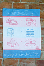 The 'Le Soufflé/Baking' Torchon features a pastel pink and blue background with lively, hand-drawn red and blue illustrations of key soufflé ingredients—butter, flour, milk, eggs, and "secret ingredients." The playful design, inspired by our Torchon contest winner, highlights that with a little "rise," it's the perfect combination for success.