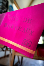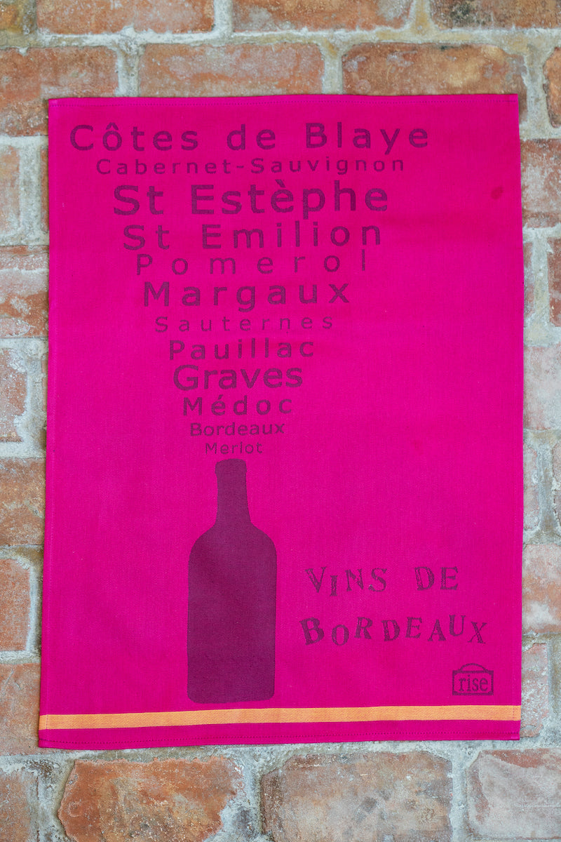 The ‘Bordeaux’ Torchon features a bold fuchsia background with deep burgundy text listing 12 revered Bordeaux wine varietals, displayed over a wine bottle silhouette. Finished with a contrasting yellow band at the bottom, this simple yet striking design brings a touch of French wine culture to your table—perfect for sharing your favorite bottle.