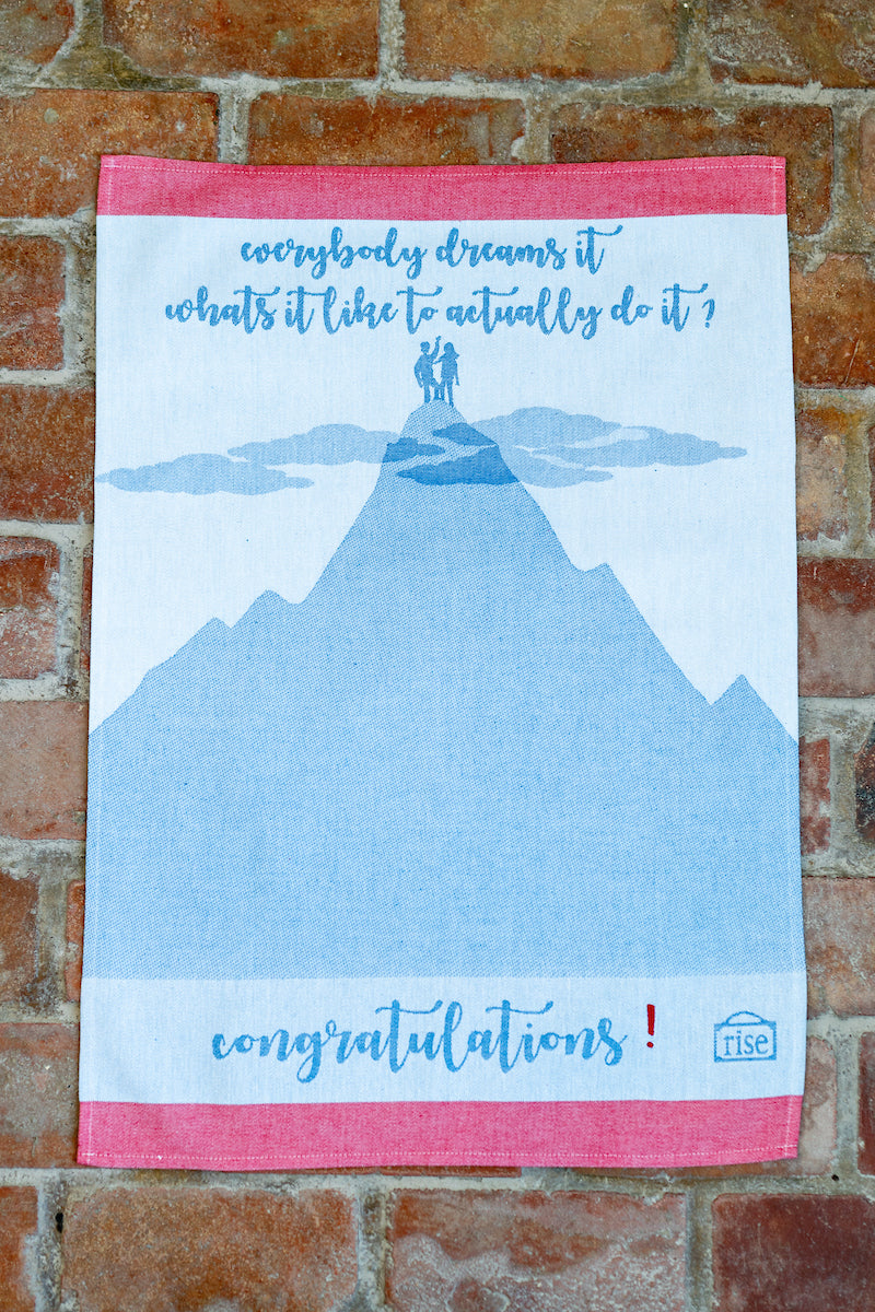 The ‘Congrats’ Torchon features soft blue hues with a triumphant couple atop a mountain, framed by clouds and accented with cheerful red bands. Inspired by a Mt. Kilimanjaro climb, this towel celebrates achievement with the message, "Everybody dreams it, what's it like to actually do it?"—a perfect reminder that we all have mountains to climb.