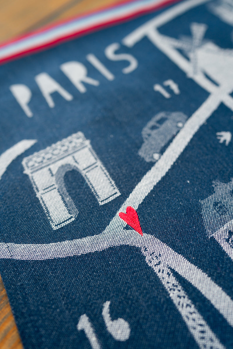The ‘Paris Map’ Torchon features an intricate design in blue and gray, highlighting famous landmarks like the Eiffel Tower, Sacré-Cœur, and Notre-Dame. Two embroidered red hearts mark the Eiffel Tower and Notre-Dame, adding a touch of love to this detailed map. Framed by alternating red and blue striped borders, the Torchon also showcases all 20 arrondissements of Paris, making it both a beautiful and educational piece. At rise, we even use this map for fun trivia contests with our guests—it's a true challenge!