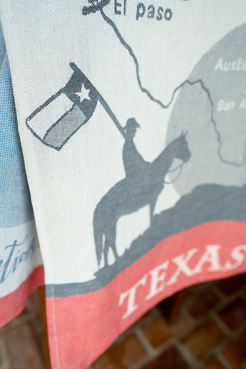The 'Texas' Torchon showcases the state map in blue and gray, featuring iconic Texas symbols like cowboys on horseback, longhorns, oil rigs, rocket ships, and the Lone Star from our state flag, this towel also includes a soufflé and the names of each city with a rise location, with more to come. Framed by a denim blue top border and a true red bottom border, it perfectly captures the essence of Texas pride and heritage.