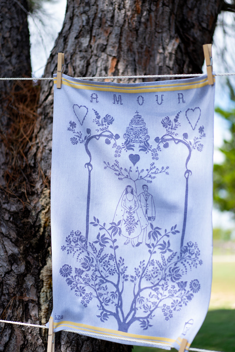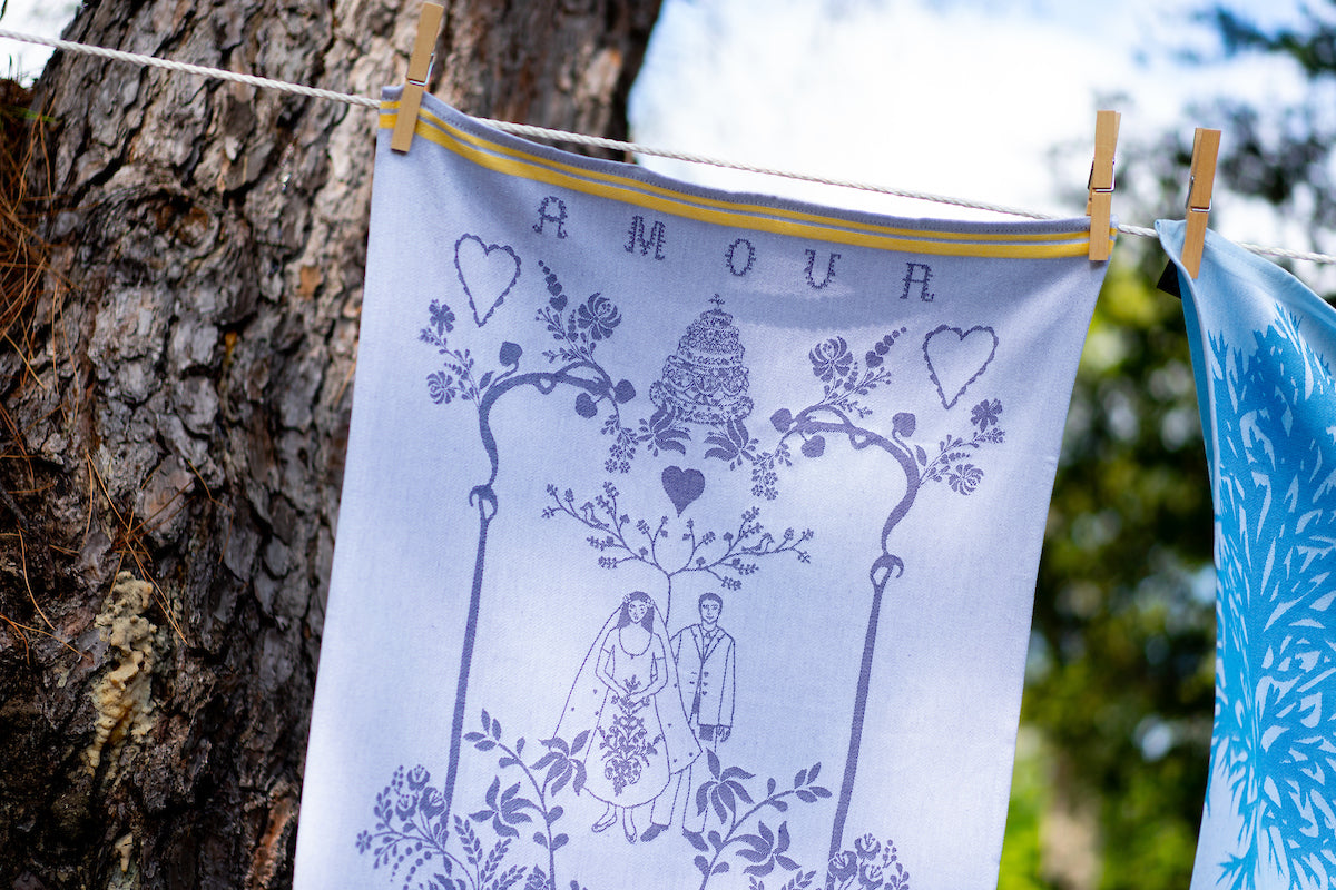 The 'Marriage' Torchon features a romantic design in soft lavender tones, depicting a bride and groom beneath a whimsical floral arch adorned with hearts and accented by delicate yellow bands. This charming towel has been a favorite bridal shower gift at rise, making it the perfect choice for engagements or anniversaries, no matter the milestone.